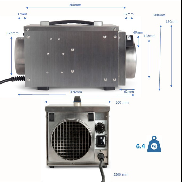Eine besondere Konstruktion mit drei Entlüftungsöffnungen und ohne Wassertank: Lufteintritt (Einlass), Austritt trockener Luft und Austritt feuchter Luft (2 Auslässe). Jede der 3 Lüftungsöffnungen verfügt über einen integrierten Flansch an denen optionale flexible Luftkanäle befestigt werden können. Die Feuchtigkeit wird durch das Absorptionsmittel entfernt und als Wasserdampf aus dem Gerät abgeleitet. Die Kondensatableitung (Rohr) hat einen Ø von 40 mm (passend für eine Standard-Klemmringverschraubung).und das Kondenswasser wird nicht als Flüssigkeit abgeleitet, sondern wie bei einem Kondenstrockner mit der Luft ausgeblasen, Das bedeutet, dass kein interner Wassertank entleert werden muss und der Luftentfeuchter rund um die Uhr in Betrieb sein kann. Wichtig für die vollautomatische Entfeuchtung ist die regelmäßige Reinigung des Filters! Der Ø der weiteren Auslässe (Luft in & Luft aus) beträgt 125 mm.