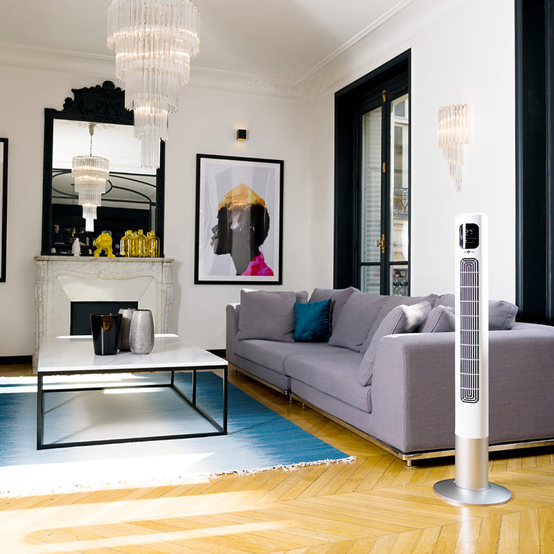 Air & Me FANTASY Ventilator ist ein Turmventilator mit einer Höhe von knapp 120 cm. Mithilfe seines Schwenkbereiches von bis zu 70° sorgt er für eine angenehme Kühle in Räumen bis zu 20 m². Der schlanke Ventilator arbeitet leise, effizient und verfügt über verschiedene Belüftungsmodi, die mit der mitgelieferten Fernbedienung reguliert werden können: Normal: Sie können aus 3 Leistungsstufen wählen Natural Breeze: arbeitet nach einem Zufallsprinzip und erzeugt eine natürliche Brise Night: Im Nachtmodus arbeitet er diskret und geräuscharm und die digitale LED-Anzeige wird deaktiviert FANTASY ist ein eleganter Design-Ventilator, der einfach zu transportieren ist und auch in kompakte, kleine Zimmer passt.
