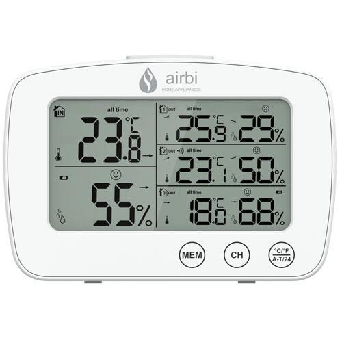 Funkthermometer mit Feuchtigkeitsmesser Der digitale Airbi Trio Thermometer Hygrometer misst die Raumtemperatur im Bereich von -10°C bis +50°C und die Luftfeuchtigkeit im Bereich von 20-95%. Das Paket enthält eine Basisstation und drei drahtlose Temperatur- und Feuchtigkeitssensoren. Messen Sie an vier verschiedenen Stellen Mit dem Airbi Trio können Sie Temperatur und Luftfeuchtigkeit an vier verschiedenen Orten überwachen. Die Funksender sind sowohl für den Innen- als auch für den Außenbereich konzipiert. Das Display mit der Möglichkeit der kurzzeitigen Hinterleuchtung bietet dem Anwender einen schnellen Überblick über alle Messgrößen, ohne zwischen den Übertragungskanälen wechseln zu müssen. Maximal- und Minimalwerte Der Airbi Trio merkt sich Maximal- und Minimalwerte für die gesamte Betriebszeit (manueller Reset) und gleichzeitig für die letzten 24 Stunden (automatischer Reset). Vorteilhaft sind auch weitere Info-Icons wie Temperatur- oder Feuchteentwicklung und Anzeige des Feuchtekomforts mittels Smiley. Der Airbi Trio verfügt auch über eine Batteriestandsanzeige, sowohl in der Basis als auch in den einzelnen Sendern. Haupteigenschaften Temperatur und relative Luftfeuchtigkeit messen Das Paket enthält auch drei drahtlose Sender Großes und klares Display mit Hintergrundbeleuchtungsoptionen Speicher für MAXIMUM- und MINIMUM-Werte Anzeige des Feuchtigkeitskomforts Anzeige der Temperaturentwicklung/Feuchtigkeit Batteriestandsanzeige