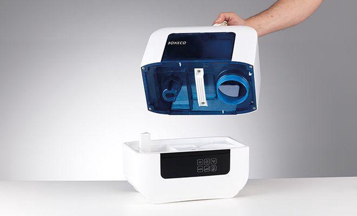 Der Boneco U700 arbeitet sauber und äußerst effektiv. Dieser Ultraschall-Luftbefeuchter verfügt über eine innovative Reinigungsfunktion, die die Wartung besonders einfach macht. Zudem überzeugt er durch sein modernes Design und seine hohe Befeuchtungsleistung. Der Boneco U700 kann sowohl kalten als auch warmen Nebel erzeugen. Die gewünschte Einstellung bestimmen Sie selbst. Ausgestattet mit Timer, Automatikmodus und einem Aromafach für ätherische Öle. Dank der High-Frequency-Technologie verteilt der Ventilator einen mikrofeinen Nebel gleichmäßig im Raum. Die austauschbare Antikalk-Kartusche sorgt für kalkfreies Wasser und verhindert weißen Staub. Der Ionic Silver Stick hemmt das Wachstum von Bakterien und Keimen im Wasser, sodass eine hohe Wasserqualität dauerhaft erhalten bleibt. Ein energieeffizienter Luftbefeuchter mit beeindruckender Leistung und zudem besonders leise im Betrieb. Die Nebelabgabe ist präzise regulierbar. Wenn der Nebel die Raumtemperatur zu stark abkühlt, kann er erwärmt werden, damit ein angenehmes Raumklima erhalten bleibt. Einige Merkmale des Boneco U700: modernes Schweizer Design, sehr schnelle und effiziente Befeuchtung, automatische Timerfunktion, Licht-Dimmfunktion für den Einsatz im Schlafzimmer, Aromafunktion, Reinigungsanzeige, automatischer Reinigungsmodus, Warmnebel-Funktion für zusätzliche Verdampfung und einfache Bedienung über ein LED-Display. Der Boneco Luftbefeuchter bietet zudem die Möglichkeit, ätherische Öle zu verwenden, um einen angenehmen Duft und eine aromatherapeutische Wirkung zu erzielen.