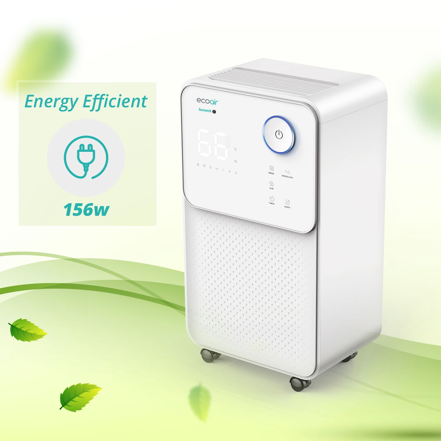 EcoAir Summit S Luftentfeuchter der Energiesparer mit einem Verbrauch von 156 Watt EcoAir Summit S Luftentfeuchter ist ein 'Niedrigenergie-Entfeuchter" mit einer Leistungsaufnahme von nur 156 Watt! Mit einem energiesparenden Luftentfeuchter können Sie Ihre Wohnumgebung komfortabel und gesund halten, ohne sich um hohe Stromkosten kümmern zu müssen. Summit S verfügt über eine Entfeuchtungskapazität von 12 Litern pro Tag in Räumen bis zu 50 m². Dieser Luftentfeuchter reinigt die Luft mit einem dreischichtigen Aktivkohlefilter - bestehend aus einem Aktivkohlefilter, einem PET-Filter (Polyethylenterephthalat) und einem Staubfilter. Dieser kombinierte Filter entfernt Staubpartikel und unangenehme Gerüche beispielsweise aus der Küche oder von Haustieren. Legen Sie den mitgelieferten mehrlagigen Aktiv-Kohlefilter mit der schwarzen Seite nach außen in den Filterrahmen ein, bevor Sie das Gerät in Betrieb nehmen. Diese Kombination aus Luftentfeuchter und Luftreiniger ist ideal und sorgt für ein gesundes Raumklima. Summit S ist einfach zu bedienen und zeigt die gemessene Luftfeuchtigkeit digital und farbcodiert auf dem übersichtlichen Display an: Blau: niedrige Luftfeuchtigkeit (< 40 % r.F.) Grün: gute Luftfeuchtigkeit (40 - 60 % r.F.) Rot: hohe Luftfeuchtigkeit (> 60 % r.F.) Stellen Sie den digitalen Hygrostat auf die gewünschte Luftfeuchtigkeit ein, programmieren Sie die Ein- und Ausschaltzeiten mit der Zeitschaltuhr oder aktivieren Sie den Schlafmodus für einen leisen Betrieb (≤ 36 dB(A)) während der Nacht. Die Kindersicherung verhindert ein versehentliches Verstellen der Einstellungen. Die entzogene Feuchtigkeit wird entweder im 2-Liter-Wassertank gesammelt oder über einen Schlauch abgeleitet (kontinuierliche Entwässerung). Merkmale: Für Räume bis 50 m² Entfeuchtungskapazität 12 Liter pro Tag Luftentfeuchter mit niedrigen Betriebskosten 156 Watt Luftzirkulation: 120 m³/h Intelligentes Display 3-farbige Feuchtigkeitsanzeige: Blau / Grün / Rot 2 Lüftergeschwindigkeiten Integrierte Hygrostat Wäsche-Modus Nacht-Modus Mehrschichtiger Kohlefilter: Carbon, PET & Nylon Auswaschbarer Filter Auto-Neustart Kindersicherung: verhindert, dass kleine oder große Hände die Geräte-Einstellungen verändern Zeitschaltuhr (Timer): 1 - 24 Stunden Automatische Abtauen Geräuscharmer Betrieb: 36 dB(A) Wassertank: 2 Liter Automatisches Abschalten bei vollem Wassertank Möglichkeit eines permanenten Kondensatanschlusses Einfach zu transportieren - "Easy Glide"-Rollen Umweltfreundliches Kältemittel: R290