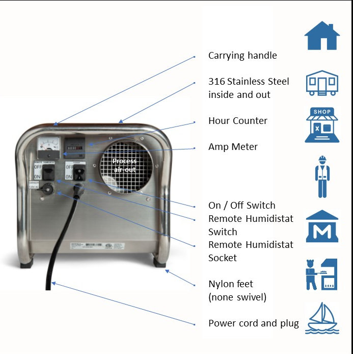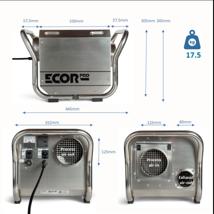 Ecor Pro DH2500 DryFan® Adsorptionstrockner ist im Verhältnis zu seiner sehr hohe Entfeuchtungskapazität von bis zu 35 Litern pro Tag sehr kompakt. Der Trockenmittel-Entfeuchter von Ecor Pro verfügt über die innovative DryFan®-Technologie und ist für Räume bis 185 m² konzipiert. Ideal für die Trocknung von feuchter Luft in beheizten oder unbeheizten Räumlichkeiten wie Wohnräume, Keller, Boote, Loft, Ferienhäuser, Garagen oder Lagerräume (Wartung und Lagerung von Waren), aber auch bei nach Überschwemmungen oder Wasserschäden. Seine Betriebstemperatur liegt zwischen -20 °C und +40 °C und dank seines geringen Gewichtes kann er einfach transportiert oder fix installiert werden. Das Gehäuse des Adsorptionsentfeuchters Ecor Pro DH2500 DryFan® ist robust und er ist in 2 Ausführungen erhältlich: Edelstahl (INOX) oder Gelb. Das „3-Löcher-Design“ (Lufteintritt, Trockenluftaustritt und Feuchtluftaustritt) benötigt keinen Wassertank und ermöglicht einen ununterbrochenen Betrieb (24/7). Rohre oder flexible Schläuche können an den Ausgängen, die mit speziellen Flanschen versehen sind, montiert werden.