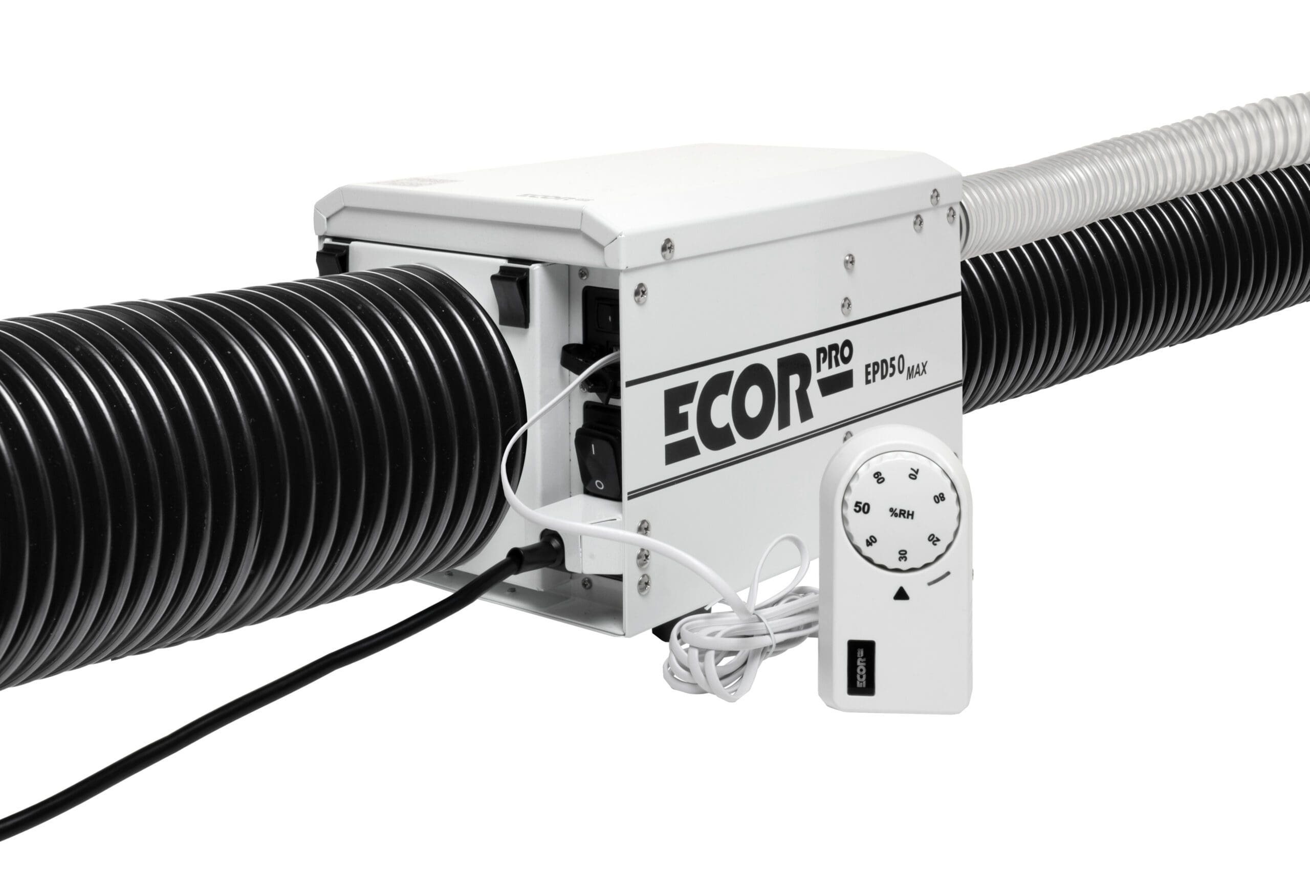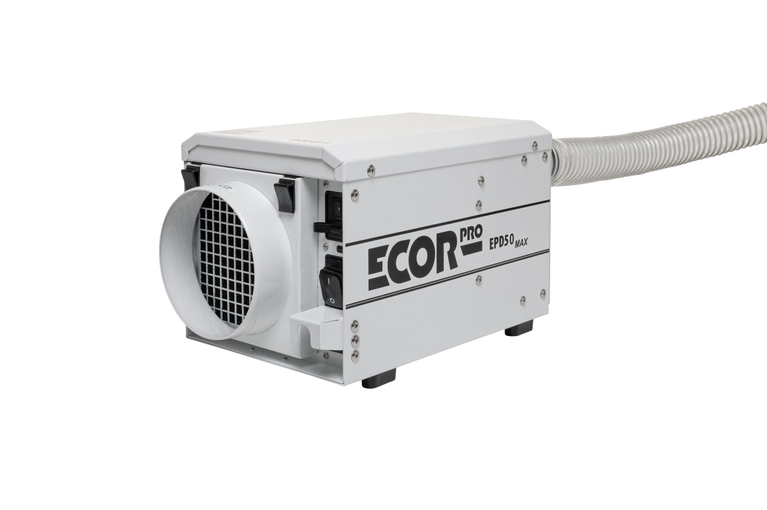 Ecor Pro EPD50-MAX Adsorptionstrockner IP24-klassifiziert und optional mit WLAN-Steuerung Ecor Pro EPD50-MAX Adsorptionstrockner ist ein Semi-PRO Trockenmittel-Luftentfeuchter und sorgt auch bei niedrigen Temperaturen für eine effektive Entfeuchtung – ohne Kondensatbildung. Ob automatischer oder kontinuierlicher Betrieb, dieser Ecor Pro hat eine Entfeuchtungskapazität von 13 Liter pro Tag in Bereichen bis 80 m². Mit dem manuellen, kabelgebundenen EPHUM-I-DRY-Hygrostat lässt sich die gewünschte Luftfeuchtigkeit einstellen und der Adsorptionstrockner senkt die Luftfeuchtigkeit automatisch, bis der eingestellte Wert erreicht ist. Auch eine kontinuierliche Trocknung ist mit diesem EPD50-MAX möglich - rund um die Uhr und ohne Überwachung. Zudem kann der kompakte EPD50-MAX mittels Rohrflanschen an ein Luftsystem angeschlossen werden. Ideal, um Häuser trockenzuhalten, Nebengebäude zu schützen und für die Bootswartung. Der Adsorptionstrockner ECOR PRO EPD50-MAX ist ideal für Anwendungen, bei denen kondensatfreie Trocknung erforderlich ist, auch bei Minusgraden. Die feuchte Luft wird über den Abluftschlauch aus dem Raum abgeführt. Durch den Verzicht auf einen Wassertank und die flexible Montage kann der Luftentfeuchter außer Sichtweite aufgestellt werden und nimmt keinen Platz auf dem Boden ein. Der Luftentfeuchter ist kompakt, stapelbar und kann vielseitig installiert (eingebaut) werden - er eignet sich auch zur Wand- oder Deckenmontage dank Dryfan®. Dryfan® ermöglicht den Betrieb in beliebigen Positionen, sogar "kopfüber". Seine IP24-Klassifizierung ermöglicht auch den Gebrauch in feuchten Bereichen (spritzwassergeschützt). Optional: WLAN-Kontrolle und Steuerung mittels Wi-Fi EPHUM-I-MAX-Remote Control & Monitor. Mit diesem optional erhältlichen WiFi EPHUM-I-MAX Monitor und Controller können Sie die Luftfeuchtigkeit von überall aus regulieren und auch die genauen Messdaten in der App ablesen. Merkmale: Für Bereiche bis Entfeuchtungskapazität 13 Liter / Tag Trockenmittel-Luftentfeuchter Lüfterkapazität: 180 m³/h Kabelgebundener EPHUM-I-DRY-Hygrostat: einfache Bedienung. Verfügt über eine zweifarbige grüne und blaue Statusanzeige im Betrieb oder im Standby-Modus sowie eine dimmbare Hintergrundbeleuchtung für das Ecor Pro-Logo. Schutzart IP24: spritzwassergeschützt Kompaktes Design und lange Lebensdauer (Nutzungsdauer) Temperaturbereich (Betrieb): - 20 °C bis + 40 °C Automatische Reset-Funktion bei eventuellem Stromausfall Serieller RJ11-Anschluss erkennt, ob ein Hygrostat vorhanden ist oder nicht.(Auch verwendet für die im Lieferumfang nicht enthaltene Cloud-Software) 10-PPI-Filter Staubfilter: schützt das Gerät und sorgt für eine gesunde Luftqualität Abluftkanal: Ableitung Kondensat / Feuchtigkeit aus Gerät Stromkabel: Einfach austauschbar für das jeweilige Land (Region), Anschluss an Generatoren oder Austausch bei Beschädigung aufgrund des patentierten Ecor Pro-Designs. Kabellänge 5 Meter Im Lieferumfang enthalten: Ein Standard-Filterhalter EPDF125 Ein-/Aus-Flanschadapter für 125-mm-/5-Zoll-Kanäle EPHUM-I-DRY-Hygrostat mit 2 m/6″ geradem weißem Kabel EPDUCT45x1 40 mm/1,5″ flexibler 1 m/3′ Feuchtigkeitsableitungskanal Optional erhältlich: WLAN-Steuerung und -Überwachung mittels Wi-Fi EPHUM-I-MAX-Remote Control & Monitor