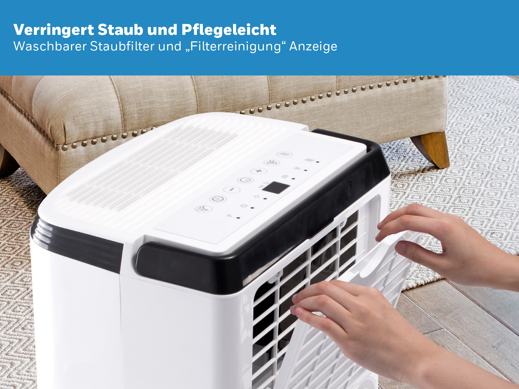 Honeywell TP SMALL 24L Luftentfeuchter - Energy Star® zertifiziert Honeywell TP SMALL 24L Luftentfeuchter ist ein kompakter, leistungsstarker und benutzerfreundlicher Entfeuchter für eine problemlose Feuchtigkeitsregulierung. Er kann einfach an Ihre speziellen Bedürfnisse angepasst werden und reguliert die relative Luftfeuchtigkeit in Räumen bis 120 m², mit einer Entfeuchtungskapazität von 24 Liter / Tag. Mit dem Energy Star Siegel (Energy Star®) werden besonders energieeffiziente Elektrogeräte ausgezeichnet (zertifiziert). Das 'entzogene' Wasser wird in einem Wassertank mit einem Fassungsvermögen von 3,3 Litern aufgefangen. Ist der Tank voll, schaltet sich der Honeywell dank der automatischen Abschaltautomatik aus. Selbstverständlich besteht auch die Möglichkeit eines permanenten Kondensatanschlusses. Das hat den großen Vorteil, dass der Entfeuchter kontinuierlich laufen kann, ohne sich Gedanken um einen vollen Wassertank machen zu müssen. Ideal fürs Erdgeschoss oder in Sommerhäusern. Der benötigte Ablaufschlauch ist im Lieferumfang enthalten. Der Honeywell kann einfach über ein blau hinterleuchtetes LED-Display mit Touch-Bedienelementen, das sich an der Oberseite befindet, gesteuert werden. Sie können die gewünschte Luftfeuchtigkeit manuell zwischen 30 - 90 % in 5%-Schritten einstellen. Der Betrieb des Gerätes kann auch mit der 24-Stunden-Zeitschaltuhr gesteuert werden. Das Gerät weist Sie auch darauf hin, wenn der Staubfilter gereinigt werden muss. Dieser kann einfach entfernt und mühelos unter einem Wasserhahn gereinigt werden. Sie benötigen keine Ersatzfilter. Zur weiteren Ausstattung zählen ein automatischer Feuchtigkeitssensor, eine automatische Abtauung und Abschaltautomatik. Beim Honeywell FP können Sie aus insgesamt 4 Betriebsarten (Modi) wählen: Wäsche-/Trocknermodus (Laundry): Maximale Leistung, um eine schnelle Entfeuchtung zu gewährleisten. Ideal zum Trocknen der Kleidung, aber auch zum Trockenhalten des Waschraums. Normaler-Modus (Dehumidifying): Entfeuchtung des Raums bei geringerer Geschwindigkeit Komfort-Modus (Comfort): Automatische Anpassung der Leistung an die relative Luftfeuchtigkeit im Raum an. Dauerbetrieb (Continuous): Geeignet für Räume, in denen eine kontinuierliche Entfeuchtung bei geringerer Geschwindigkeit mit einem Zielwert von 30 % RH oder weniger erforderlich ist. Honeywell Luftentfeuchter ist mobil und einfach zu transportieren (4 Rollen und robuster Griff). Dieser tragbare Luftentfeuchter hilft Ihnen täglich, Feuchtigkeit aus kleinen bis mittelgroßen Räumen wie Schlafzimmern, Arbeitszimmern, Badezimmern und Wohnzimmern zu entfernen. Er entfernt effektiv Feuchtigkeit aus der Luft und schützt nicht nur Ihre Gesundheit, sondern auch die Inneneinrichtung wie Wände, Kleidung, Vorhänge, Möbel und Geräte vor Schimmel und Mehltau. Merkmale: Energy Star® zertifiziert Für Bereiche bis 120 m² Entfeuchtungskapazität: 24 Liter / Tag Spritzwassergeschützt Einfache Bedienung mittels LED-Display 4 Betriebsarten (Modi) Wäschetrockner-Modus – Effizient und umweltfreundlicher Geräuscharmer Betrieb: maximal 49,5 dB(A) Timer: 24-Stunden-Zeitschaltuhr Abschaltautomatik Automatischer Neustart Automatische Abtauung Wasserbehälter (3,3Liter) Automatisches Abschalten bei vollem Wassertank Möglichkeit eines permanenten Kondensatanschlusses Ablaufschlauch im Lieferumfang enthalten Umweltfreundliches Kältemittel R290 Integrierte Handgriffe und Rollen Filterkontrollanzeige: herausnehmbarer und waschbarer Staubfilter Betriebstemperatur: 5 - 32 °C Feuchtigkeitssensor (Hygrometer): 30 % - 90 % Hergestellt mit 11-stufigen Sicherheits- und Qualitätsprüfungen zum Schutz vor Überhitzung und als Gewährleistung für eine lange und leistungsstarke Nutzungsdauer.