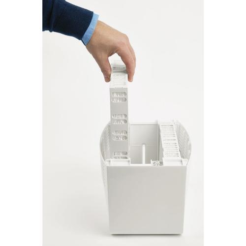 Stylies Helos Luftbefeuchter mit Kaltvernebelungs- und Luftreinigungsfunktion befeuchtet und reinigt die Luft in Räumen bis 45 m², mit einer Befeuchtungskapazität von 0,3 Liter / Stunde. Dieser Kaltwasser-Verdunster arbeitet fast geräuschlos und filtert mithilfe der antibakteriellen Filterkassetten auch Pollen und Schmutzpartikel aus der Luft. Stylies Helos ist ideal für Schlaf-, Kinderzimmer oder Büro - sowohl für den privaten als auch gewerblichen Einsatz. Zur weiteren Ausstattung gehören ein Wasserbehälter (4 Liter), Zeitschalter (Timer), integrierter Hygrostat, Nachtmodus und Duftbehälter. Designed by Fabian Zimmerli / Made in Switzerland