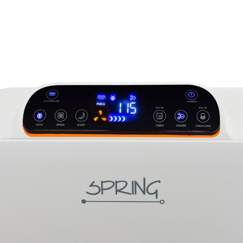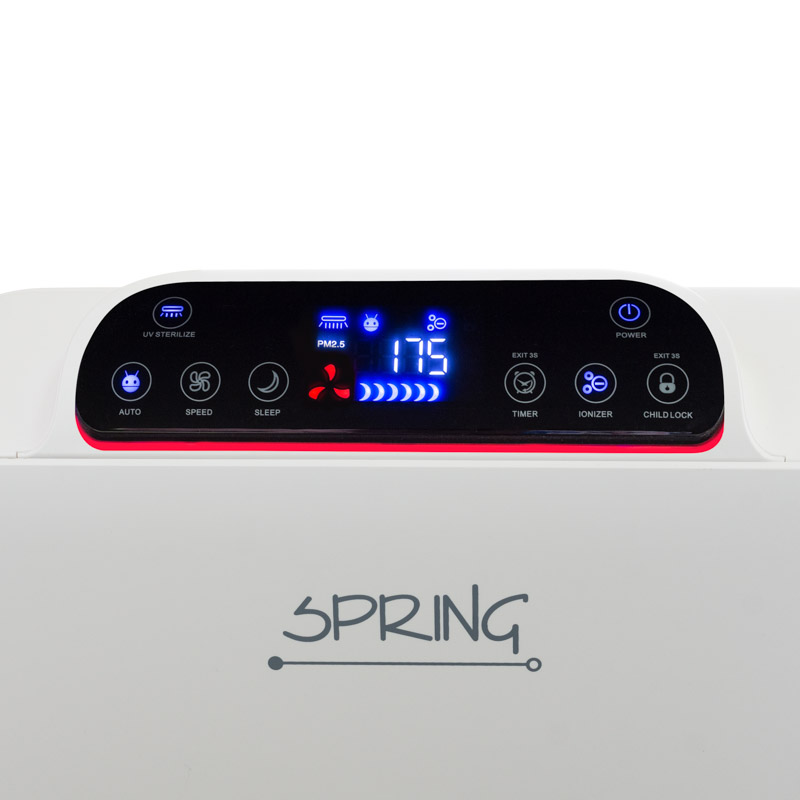 Airbi SPRING – HEPA Luftreiniger mit Ionisator & UV-Lampe Der Airbi SPRING Luftreiniger hilft Personen mit Allergien und Atemwegserkrankungen dabei um wieder tief durchatmen zu können und frische, gesunde Luft durch den Körper strömen zu lassen. Dieser leistungsstarke und flüsterleise HEPA-Luftreiniger filtert effektiv Staubpartikel, Pollen, unangenehme Gerüche oder chemische Gase in Räumen bis 50 m², in privaten oder gewerblichen Bereichen. Der SPRING-Luftreiniger übertrifft seine Konkurrenten auf dem Markt mit seinen zahlreichen Betriebsfunktionen wie Nacht-Modus, Zeitschaltuhr (Timer), Kindersicherung, Ionisator (Negativ-Ionen-Generator) und dem zuschaltbaren UV-Licht. Der größte Vorteil des Luftreinigers ist sein automatischer Betriebsmodus (SMART-Modus), der mithilfe der eingebauten Luftqualitätssensoren die Luftqualität überwacht und automatisch die Lüftergeschwindigkeit anpasst. Der ultraleise Motor des Airbi SPRING hat einen Geräuschpegel von nur 28 d(B). Zur weiteren Ausstattung zählt ein sehr präziser Partikelsensor (Geruchs- und Verschmutzungsdetektor), der Partikel bis zu einer Größe von 2,5 µm erkennt. Der Airbi SPRING ist ein 2-in-1 Gerät: Luftreiniger und Luftentkeimer und die einzelnen Funktionen werden auf einem übersichtlichen und großen LED-Display angezeigt. Die Bedienung des Airbi ist kinderleicht und erfolgt über die Touch-Tasten auf dem Display oder über die mitgelieferte Fernbedienung. Das 7-Stufen-Filtersystem des Airbi SPRING Vorfilter - Hauptfunktion des waschbaren Filters besteht darin, grobe Staubpartikel wie z. B. Tierhaare aufzunehmen. Hierdurch wird auch die Lebensdauer der anderen Filter verlängert. Katalysatorfilter - entfernt Ammoniak, Benzol, TVOC und anderen schädlichen Gase. Aktivkohlefilter - absorbiert Gerüche wie beispielsweise Formaldehyd. Antibakterieller Filter - filtert feinste Staubpartikel und Mikroorganismen (entfernt Bakterien & beugt Schimmel vor) Echter HEPA-Filter – filtert Partikel mit 0,1 μm und hat einen Wirkungsgrad von 99,9 %(entfernt z. B. Staub, Pollen, Rauch oder tierische Allergene) UV-Lampe - unterstützt die Luftreinigung. Das Licht der UV-Lampe mit einer Wellenlänge von 365 nm zerstört die in der Luft befindliche Mikroorganismen, einschließlich Bakterien und Viren. Ionisator - der Generator erzeugt eine große Menge negativer Ionen, die in der Luft befindlichen kleine Verunreinigungen binden. Ein sehr nützliches Hilfsmittel ist das Kontrollsystem für den rechtzeitigen Filterwechsel. Anwendungsbereiche sind Wohnzimmer, Schlafzimmer, Kinderzimmer, Büro oder andere Bereiche bis 50 m². Merkmale: Geeignet für Räume bis 50 m² Leistung 320 m³/h Vier verschiedenen Betriebsmodi Moderner Lasersensor: misst Partikel bis zu 2,5 µm 7-faches Filtersystem (Mehrfachfiltersystem) Filterwechsel-Kontrollsystem HEPA-Filter & Aktivkohle-Filter Leistungsstarker Ionisator UV-Lampe zur Luftentkeimung (zuschaltbar) Übersichtliches LED-Display (Farbe) Auto-Modus Fernbedienung Nacht-Modus Kindersicherung Zeitschaltuhr / automatische Luftreinigung Geräuscharm (sehr leiser Motor) - 28 dB(A) integrierter Luftqualitätssensor mit farbiger Luftqualitätsanzeige