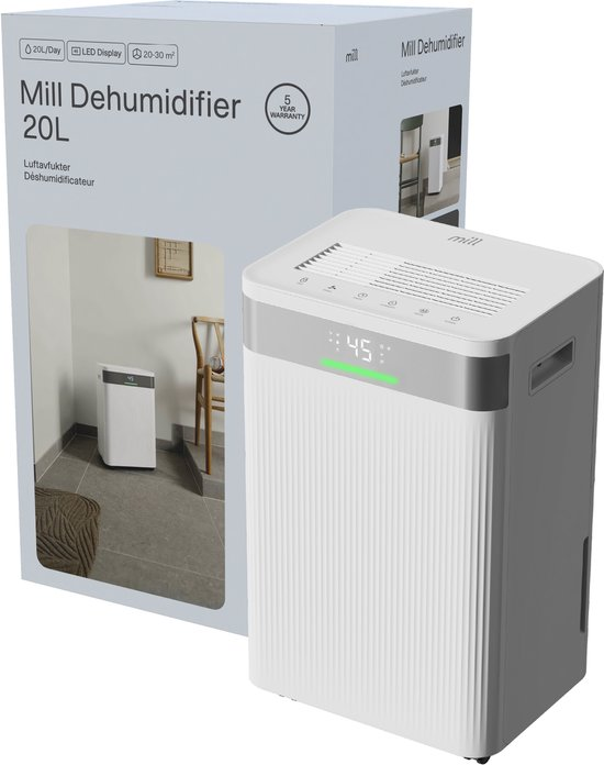 Mill MDH20 Luftentfeuchter – Kompakt, leistungsstark und elegant Mill MDH20 Luftentfeuchter ist leistungsstark und elegant. Mit einer Entfeuchtungskapazität von bis zu 20 Litern pro Tag und eignet sich ideal zur Regulierung der Luftfeuchtigkeit in Wohnräumen bis 30 m². Sein modernes skandinavisches Design, der leise Betrieb und die praktischen Funktionen machen ihn zur perfekten Wahl für kleinere Räume wie Schlafzimmer, Keller oder Waschräume. Mit dem Mill MDH20 beugen Sie effektiv Schimmelbildung, muffigen Gerüchen und Feuchtigkeitsproblemen vor und schaffen ein gesünderes, angenehmeres Raumklima. Der Luftentfeuchter bietet intelligente Funktionen und eine besonders einfache Bedienung. Das LED‑Display zeigt die aktuelle Luftfeuchtigkeit an, während das integrierte Hygrometer präzise misst und der Hygrostat den gewünschten Feuchtigkeitswert automatisch zwischen 30 % und 80 % hält. Eine Timerfunktion (1–24 Stunden) sowie eine Kindersicherung erhöhen den Bedienkomfort und die Sicherheit. Dank der Füllstandsanzeige wissen Sie jederzeit, wann der 2‑Liter‑Wassertank geleert werden muss. Für den Dauerbetrieb kann ein Ablaufschlauch angeschlossen werden (im Lieferumfang enthalten). Mit nur 41 dB(A) zählt der Mill MDH20 zu den leisen Luftentfeuchtern. Zwei Ventilatorgeschwindigkeiten und drei Betriebsprogramme ermöglichen eine optimale Anpassung an unterschiedliche Anforderungen: DRY‑Modus (Trocknen/Laundry): erhöhte Luftzirkulation für besonders schnelle Entfeuchtung – ideal zum Wäschetrocknen. AUTO‑Modus: passt den Betrieb automatisch an die gemessene Luftfeuchtigkeit an. SLEEP‑Modus: besonders leiser Betrieb mit gedimmter Beleuchtung und reduzierter Ventilatorgeschwindigkeit. Auch in kühleren Umgebungen überzeugt der MDH20: Er arbeitet zuverlässig ab 5 °C und eignet sich damit ideal für Keller, Garagen oder Lagerräume, wo er Schimmel, feuchte Wände und Holzverformungen effektiv verhindert. Dank stabiler Rollen und praktischem Tragegriff lässt sich das Gerät mühelos transportieren und flexibel in verschiedenen Räumen einsetzen. Merkmale: Für Räume bis 30 m² Entfeuchtungsleistung: 20 Liter pro Tag Extrem leise: nur 41 dB(A) Stromverbrauch – max 420 Watt Stilvolles und kompaktes Design 2 Leistungsstufen 3 Betriebsmodi: AUTO/DRY/SLEEP Waschbarer Luftfilter Integrierter Hygrostat Automatisches Abtauen Wassertank: 4 Liter Alarm bei vollem Wassertank Möglichkeit eines permanenten Kondensatanschlusses (Ablaufschlauch im Lieferumfang enthalten) Automatischer Neustart nach einem Stromausfall unter Beibehaltung der Einstellungen Kindersicherung Praktische Tragegriffe und Transportrollen 5-Jahre-Garantie von Mill Mill MDH20 Luftentfeuchter für eine frische und gesunde Raumluft.