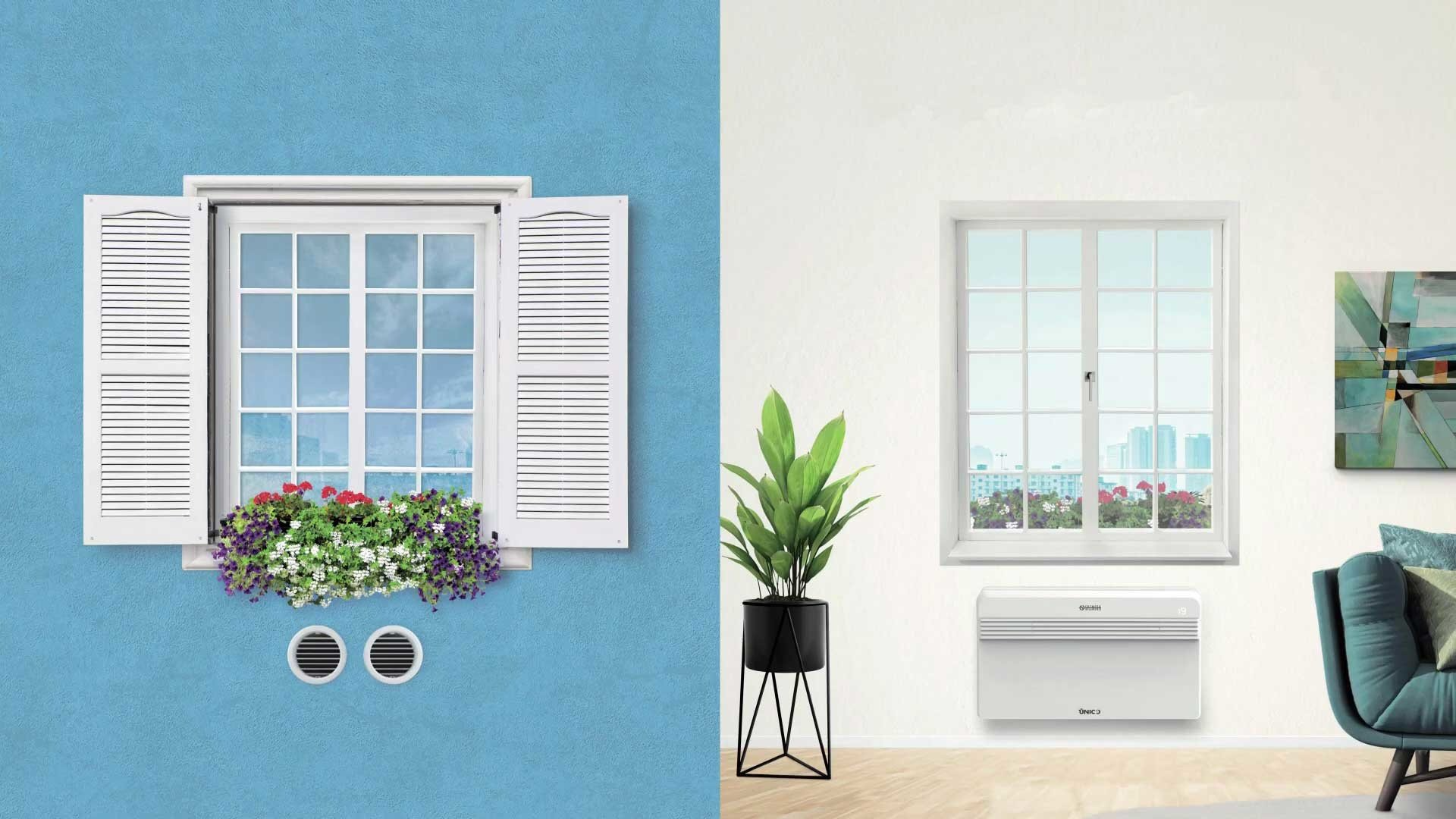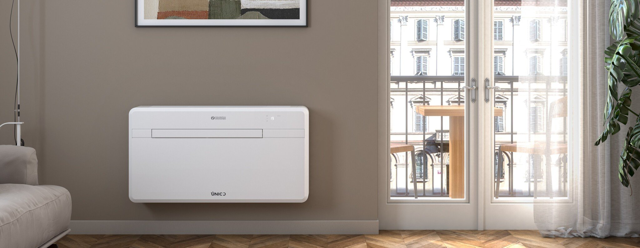 Unico Evo 30HP EVANX Monoblock-Klimaanlage - wählen Sie kompromisslosen Komfort Olimpia Splendid Unico EVO 30 HP EVANX Monoblock-Klimaanlage mit Wärmepumpe zur Selbstmontage und ohne Außeneinheit. Genießen Sie das ganze Jahr über maximalen Komfort! Die Unico-Modelle sind perfekt für Bereiche, in denen die Installation eines herkömmlichen Split-Geräts nicht möglich oder gewünscht ist. Dank der einfachen Montage, seinem kompakten Design (18 cm breit) und dem Verzicht auf ein Außengerät sind sie ideal für Wohnungen, denkmalgeschützte Gebäude, Geschäftsbereiche oder Ferienhäuser. Dieses All-in-One-System mit integrierter Wärmepumpentechnologie (HP) ist eine lohnende Investition. Es überzeugt mit seinem flüsterleisen Betrieb und sorgt dank der Inverter-Technologie für eine Energieeinsparung von bis zu 30 % gegenüber herkömmlichen Klimaanlagen (energieeffizient). Außerdem erkennt dieses Modell niedrige Außentemperaturen und schaltet mithilfe eines modulierenden, elektrischen Widerstands automatisch von Wärmepumpe auf Elektroheizung um. Selbst bei extrem niedrigen Temperaturen liefert der Unico EVO eine konstante Heizleistung. Wie bei den anderen Modellen stehen auch hier vier Betriebsarten (Modi) zur Auswahl: Kühlen, Lüften, Entfeuchten und Heizen. Diese Funktionen können natürlich auch unabhängig voneinander ganzjährig in Räumen bis 30 m² verwendet werden und können am intuitieven Display mit Hintergrundbeleuchtung abgelesen werden. Die Steuerung erfolgt entweder über die Touch-Bedienung direkt am Gerät, die im Lieferumfang enthaltene Fernbedienung, über die OS HOME App (integriertes WiFi) oder dem RS485-Anschluss (Modbus RTU - BMS-kompatibel). Mit der OS HOME App können Sie Ihren UNICO einrichten, programmieren und steuern, wo und wann Sie möchten: Temperatur, Lüftergeschwindigkeit oder Betriebsmodi. Modulierender, elektrischer Widerstand (elektrisches Heizelement): unterhalb einer bestimmten Temperatur (Werkseinstellung 4°C) schaltet das Gerät automatisch von Wärmepumpe auf Elektroheizung um und garantiert eine konstante Heizleistung. Der elektrische Widerstand arbeitet modulierend, die Leistungsabgabe variiert je nach der eingestellten Lüftungsgeschwindigkeit (1,50 kW bei Vmin, 1,75 kW bei Vmed und 2,00 kW bei Vmax). Inverter-Technologie: Energieeinsparung von bis zu 30 % gegenüber herkömmlichen Klimaanlagen SYNC Power System (für akustischen Komfort): besteht aus einem hocheffizienten Twin-Rotationskompressor und einer intelligenten Steuerungstechnologie, die perfekt aufeinander abgestimmt sind. Dadurch bietet dieses Gerät hervorragende Leistungen bei minimalem Geräuschpegel. Im Silent-Modus beträgt der Geräuschpegel maximal 30 dB(A). 4 Modi: Nur Heizen / Nur Kühlen / Nur Ventilator (nur Lüfterbetrieb) / Nur Entfeuchten ECO-Modus: Ermöglicht Energieeinsparung durch automatische Optimierung der Geräteleistung Auto-Modus: ändert Parameter mithilfe der Umgebungstemperatur Nacht-Modus: erhöht die eingestellte Temperatur schrittweise und reduziert die Geräuschemission für mehr Komfort während der Nacht (leiser Betrieb). RS485-Anschluss: für die Steuerung der Klimaanlage mit einem externen BMS in der Sprache Modbus RTU vorgesehen. Bei den Olimpia Splendid Unico ist alles kompakt in einem Gerät integriert, während es bei herkömmlichen Klimageräten auf zwei Einheiten verteilt ist. Die Montage kann jeder Heimwerker problemlos selbst durchführen. Somit haben Sie einen geringen Installationsaufwand und keine störende Außeneinheit an der Fassade. Das Gerät ist ideal für geschützte Bauten, da nur zwei Lüftungsöffnungen (1 Zuluft und 1 Abluft) und ein kleines Loch für den Kondenswasserablauf benötigt werden. Zur weiteren Ausstattung gehört ein Multifiltersystem, bestehend aus elektrostatischem Filter (mit Anti-Staub-Funktion) und Aktivkohlefilter (wirksam gegen Gerüche). Die Filter sollten regelmäßig auf Verschmutzung geprüft und bei Bedarf gereinigt werden. Wärmepumpentechnik (HP): Wärmepumpe Klimaanlage – hiermit können Sie die traditionelle Heizung in den Übergangszeiten ersetzen oder unterstützen. ("COOL ONLY" deaktiviert die Heizfunktion und "WARM ONLY" deaktiviert Kühlfunktion.) Merkmale: Monoblock-Klimaanlage ohne Außengerät zur Selbstmontage 4 Betriebsfunktionen (4-in-1): Heizung, Kühlung, Entfeuchtung und Belüftung Wärmepumpen-Klimaanlage zur Kühlung und Zusatzheizung (HP) Modulierender, elektrischer Widerstand + elektrisches Heizelement: für zusätzliche Unterstützung bei niedrigen Temperaturen (Wärmepumpe + elektrisches Heizelement) Für Bereiche bis 30 m² Einfache Bedienung: Display mit Hintergrundbeleuchtung und Touch-Bedienung direkt am Gerät, Fernbedienung, über die OS HOME App (integriertes WiFi) oder RS485-Anschluss Kühlleistung 3,1 kW (Energieklasse: A) Heizleistung 2,7 kW (Energieklasse: A) SYNC Power System: noch effektiver und leiser mit einem Geräuschpegel: 26 dB(A) - 42 dB(A) Inverter-Technologie: sorgt für eine Energieeinsparung bis zu 30 % Twin-Rotationskompressor Entfeuchtungsleistung: 0,7 Liter/Stunde = 16,8 Liter/Tag. 3 Lüfterstufen + Swingfunktion Luftverdrängung: bis 410 m³/h Großer Luftauslass: regulierbar und für eine gleichmäßige Luftverteilung im Raum Durchmesser der 2 Lüftungslöcher (Ø 162mm/Ø 202 mm.) Bitte beachten Sie: Die serienmäßig mitgelieferten Luftauslässe haben eine Größe von Ø 202 mm Zeitschaltuhr (Timer) Mit Multifiltersystem: elektrostatischem Filter (Anti-Staub) & Aktivkohlefilter Kältemittel R32 Wandbefestigung Kein auffälliges Klimagerät an der Außenwand - nur zwei Lüftungslöcher und ein kleines Loch für den Kondenswasserablauf!