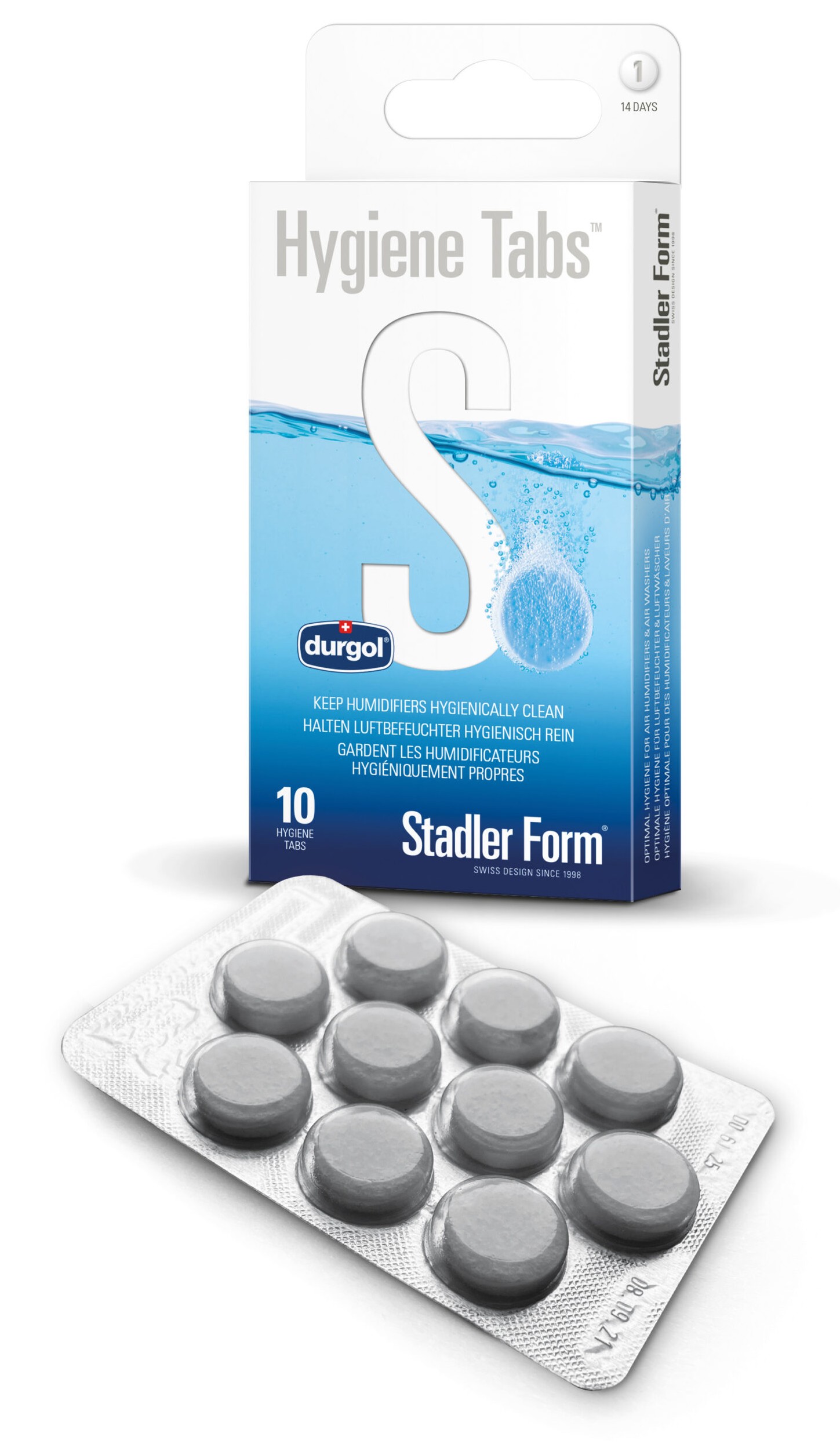 Stadler Form Hygiene Tabs (10er‑Pack) Stadler Form Hygiene Tabletten im praktischen 10er-Pack für Ihren Luftbefeuchter & Luftwäscher. Die Hygiene Tabs von Stadler Form sorgen zuverlässig für hygienisch sauberes Wasser in Ihrem Luftbefeuchter oder Luftwäscher. Bei den in der Schweiz entwickelten Tabletten handelt es sich um ein Produkt, das sich vollständig im Wasser auflöst und sofort wirkt – ganz ohne störenden Geruch. Die Wirkung einer Tablette hält bis zu zwei Wochen an und bleibt selbst bei täglichem Nachfüllen aktiv. Die Tabs sind biologisch abbaubar und sicher für Mensch, Tier und Umwelt.
