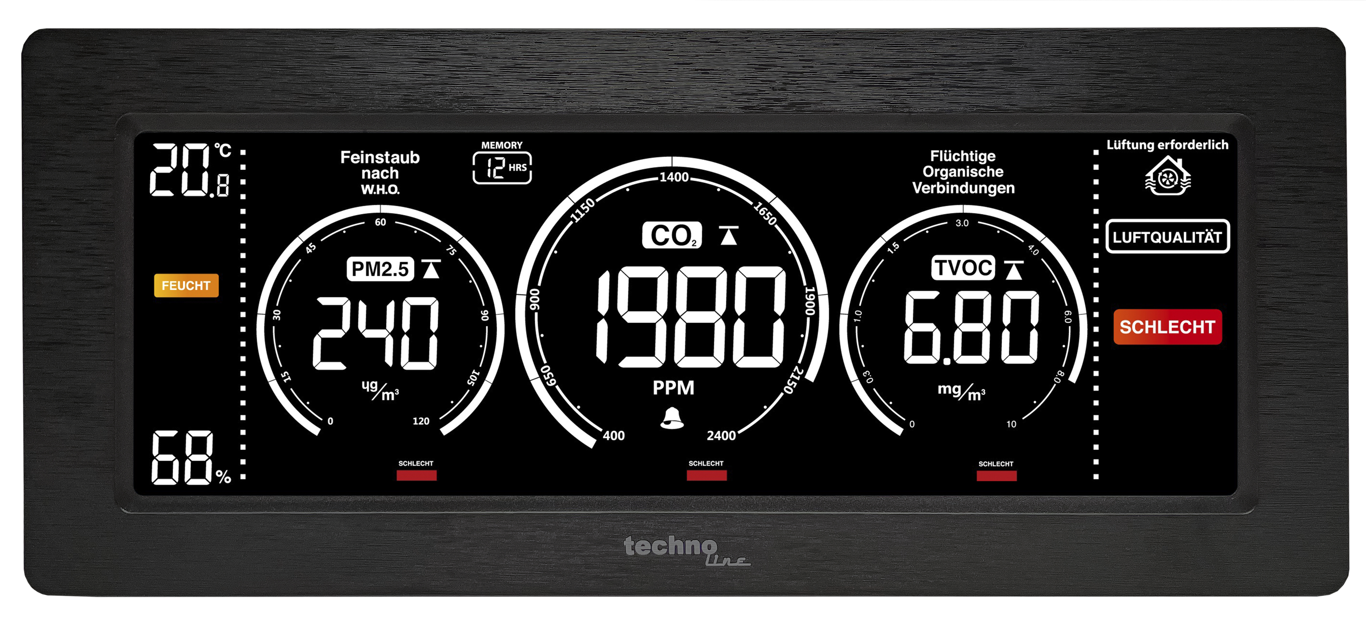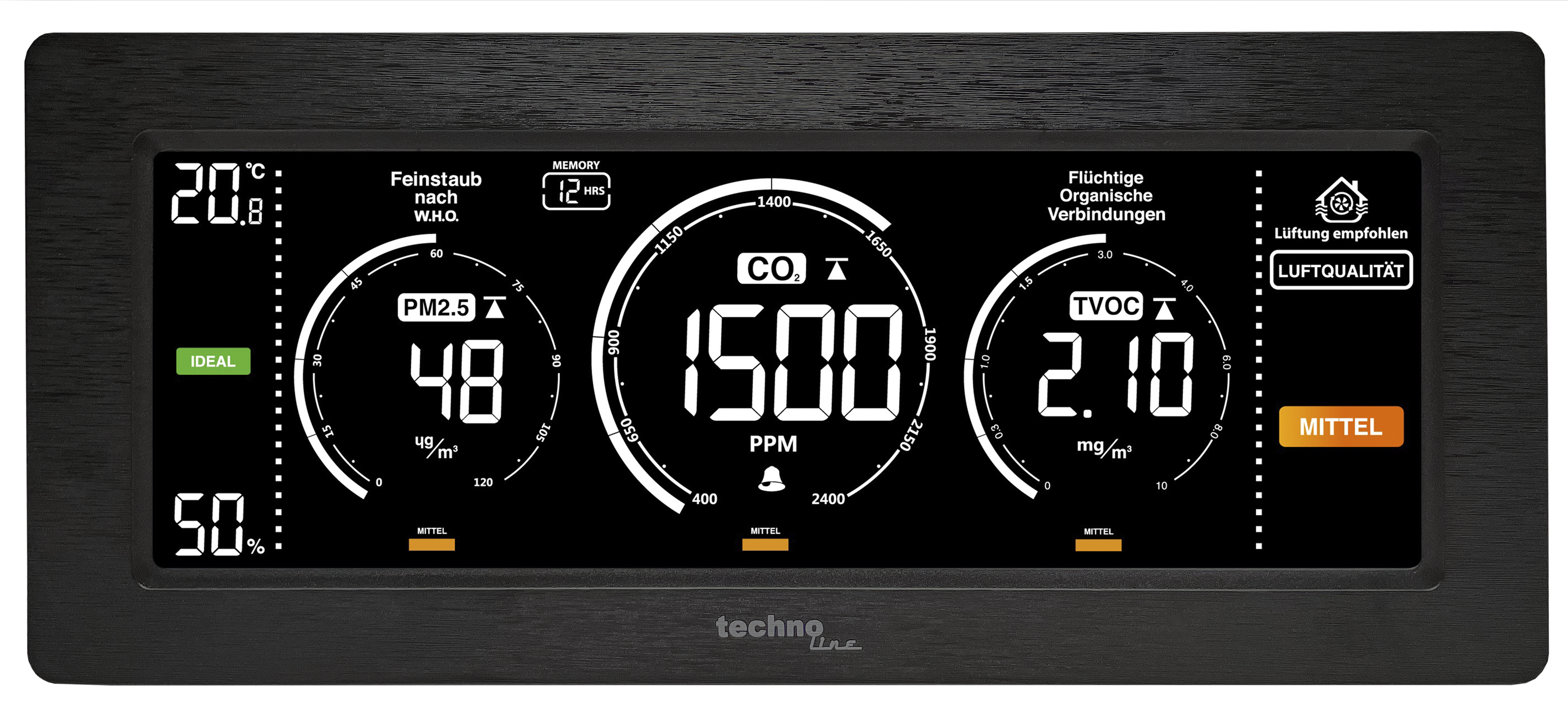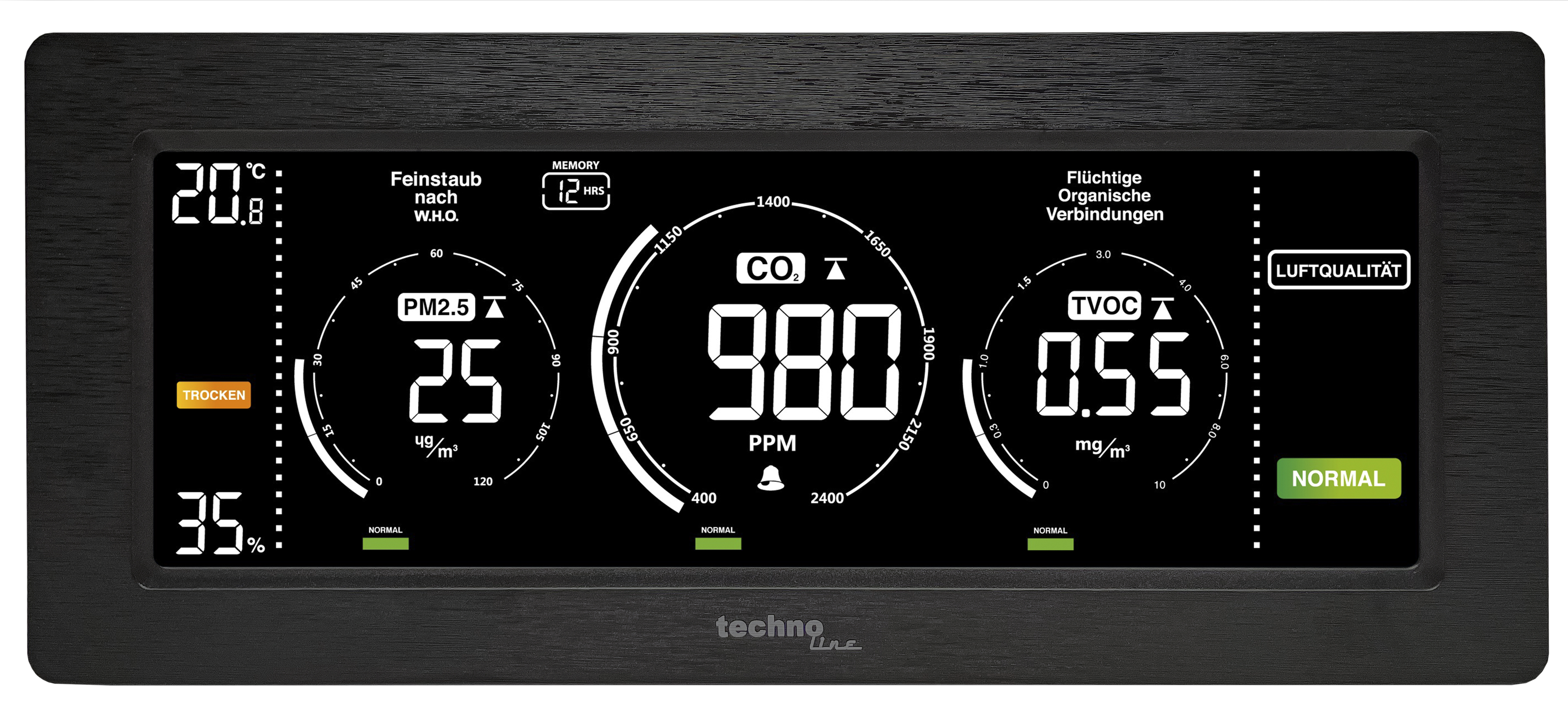Technoline WL1035 Luftqualitätsmessgerät mit Ampelfunktion und Hintergrundbeleuchtung Technoline WL1035 Luftqualitätsmessgerät zur Überwachung der Raumluftqualität. Dieser Luftqualitätsmonitor kontrolliert: CO₂-Konzentration TVOC Feinstaub (PM 2.5) Raumtemperatur Luftfeuchtigkeit (rF). Die Messwerte sind am übersichtlichen, großen Display einfach abzulesen und dank der praktischen Ampelfunktion mit Belüftungsempfehlung können Sie die Messparameter rasch auswerten und interpretieren. Außerdem warnt die Ampelfunktion bei Überschreitungen gesunder Werte. Mit einstellbarem Alarm, programmierbarem MIN/MAX-Speicher für Thermo-Hygro, PM 2.5, CO₂ und allgemeine Luftqualität, automatische Kalibrierung und farbigen Anzeigeelementen. Schlechte Raumluft kann die Gesundheit schädigen. Regelmäßiges und rechtzeitiges Lüften ist daher unerlässlich für ein gesundes Raumklima. Merkmale Luftqualitätsmessgerät zur Überwachung der Raumluftqualität Messung und Anzeige von Feinstaub nach W.H.O. (PM2,5), flüchtige organische Verbindungen (TVOC) und CO₂ Anzeige der Innentemperatur Innenfeuchtigkeitsanzeige Farbige Anzeigeelemente Automatische Kalibrierung der PM2,5-, TVOC- und CO₂-Basislinien Blinkende Informationsanzeige bei zu trockenem oder zu feuchtem Raumklima (Schimmelgefahr) Einstellbarer Alarm für hohen oder niedrigen CO₂-Gehalt mit optionalem akustischem Alarm MIN/MAX-Speicher für Thermo-Hygro, PM2,5, TVOC, CO₂ und allgemeine Luftqualität mit programmierbarer Dauer bis zu 36 Stunden Eingebauter Speicherchip zum Speichern von Einstellungen Hintergrundbeleuchtung mit einstellbaren Helligkeitsstufen Wand- oder Tischmodell Spezifikationen CO₂-Messbereich: 400 bis 5000 ppm PM2,5-Messbereich: 0 bis 999 ug/m³ TVOC-Messbereich: 0,2 bis 9,99 mg/m³ Stromversorgung: Netzteil und USB-Kabel (im Lieferumfang enthalten)