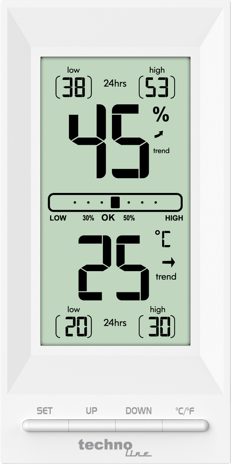 Technoline WS 9129 Thermometer / Hygrometer ist eine kleine, moderne Wetterstation in einem hochwertigen Design. Diese Thermo-Hygro-Station misst nicht nur die Luftfeuchtigkeit und Temperatur, sondern zeigt auch den Temperatur- und Luftfeuchte-Trend an (Trendanzeige). Das Besondere an dieser Wetterstation ist, dass die Temperatur- und Luftfeuchtewerte individuell kalibriert werden können. Geeignet zur Wandaufhängung oder Tischaufstellung.
