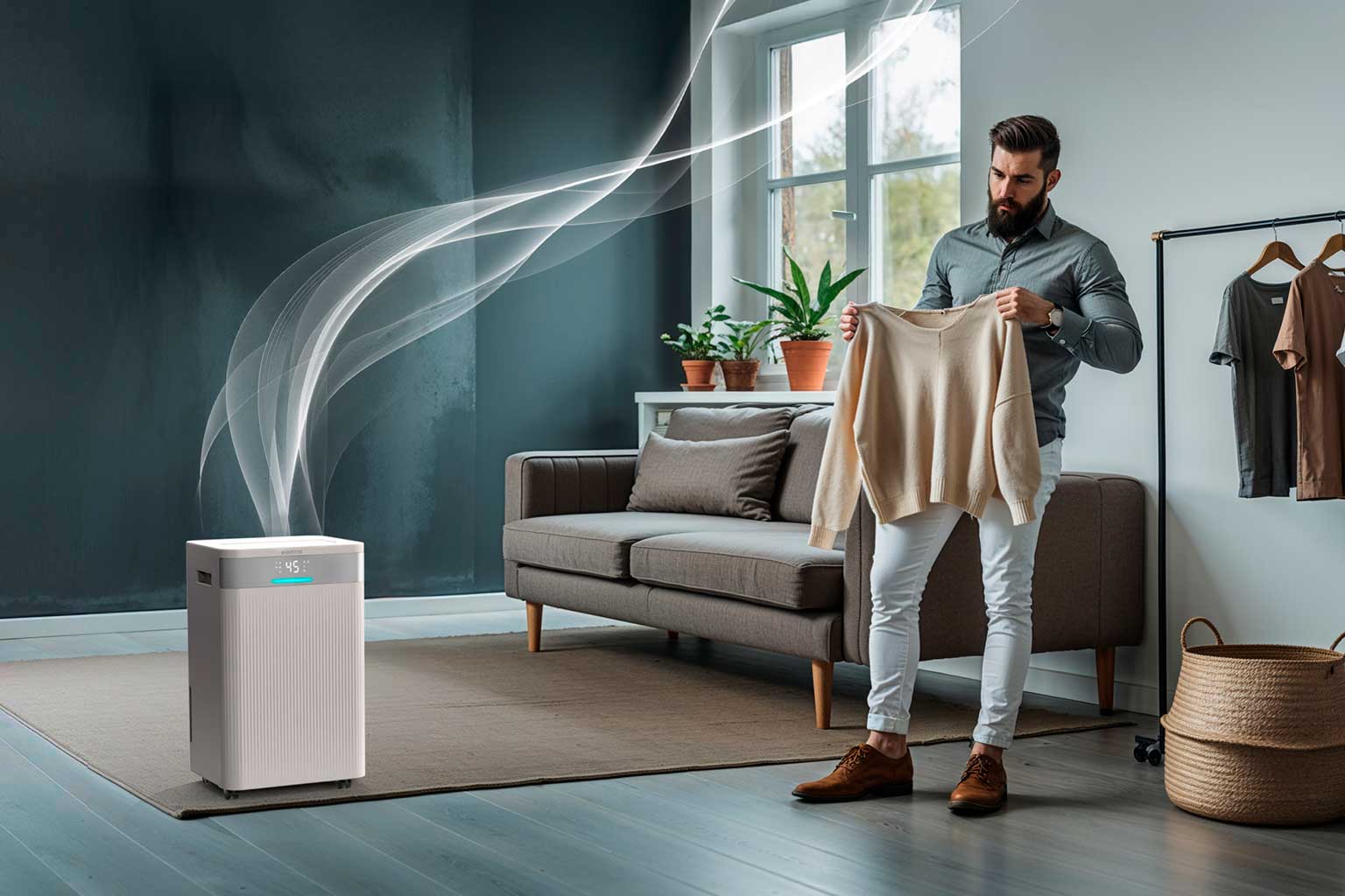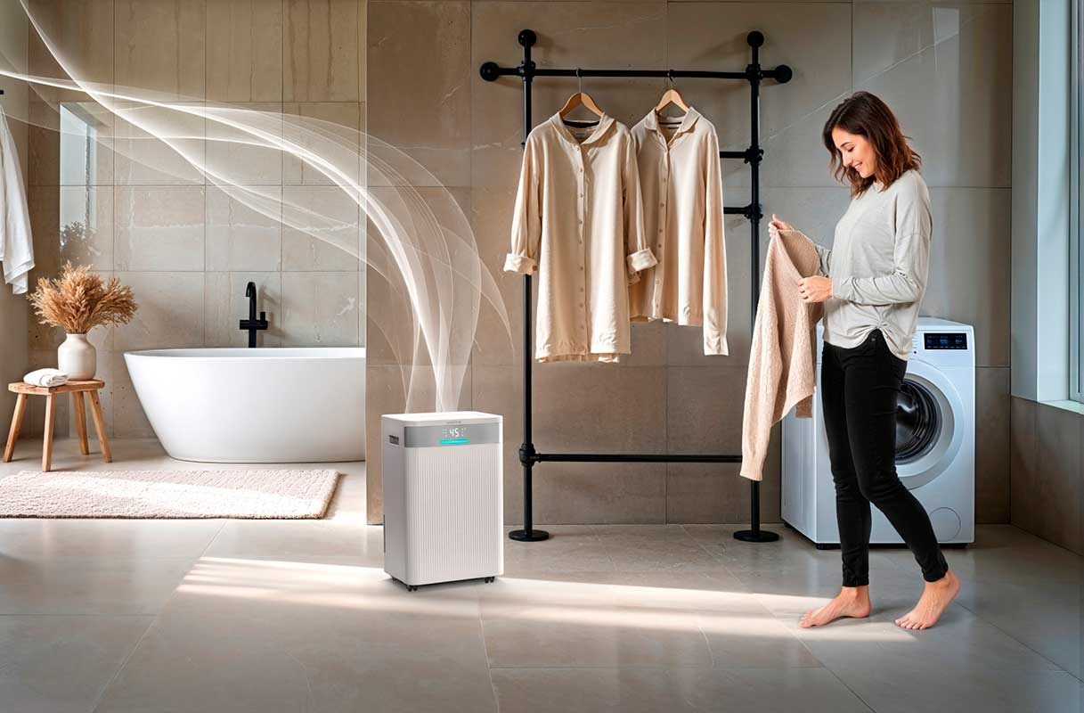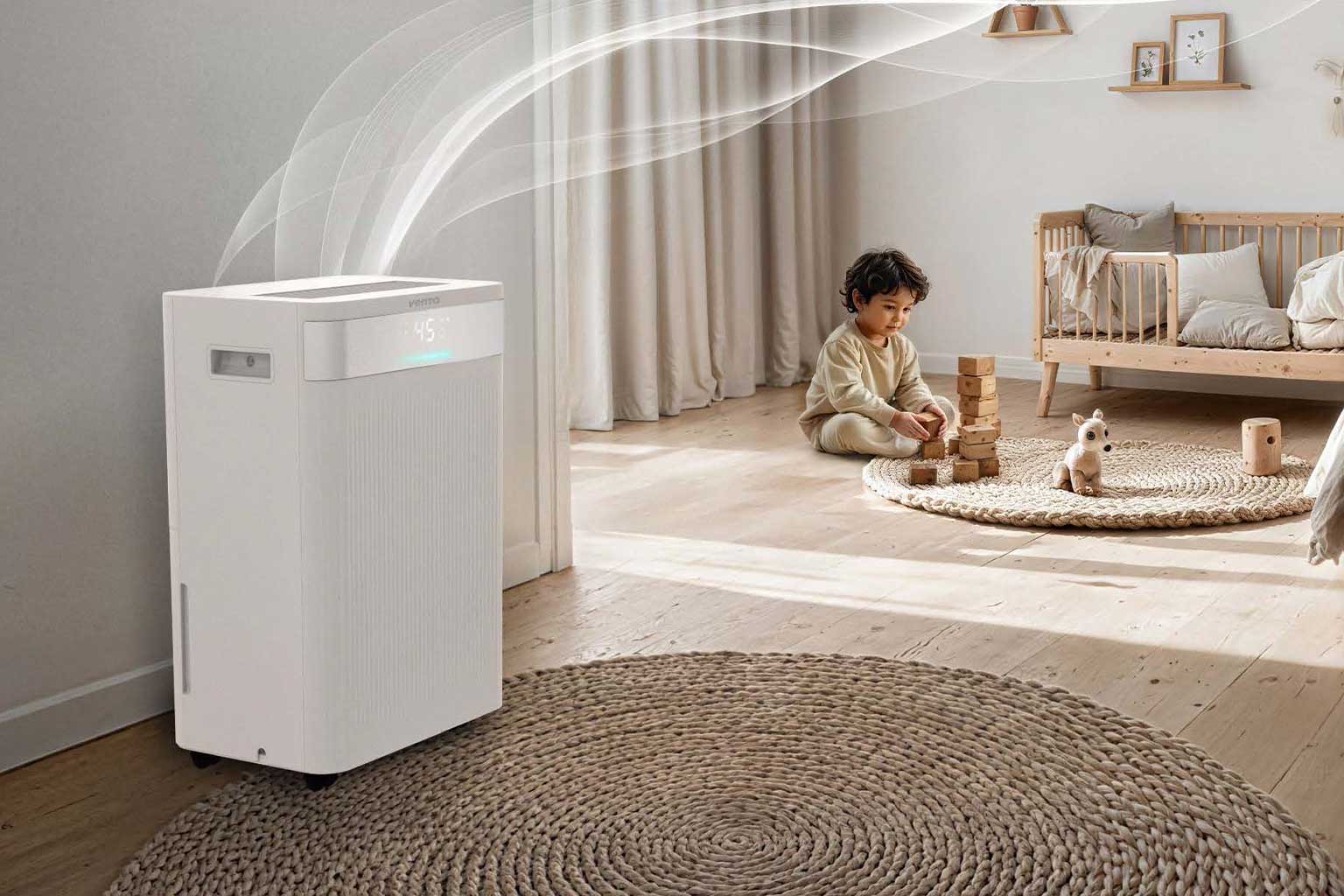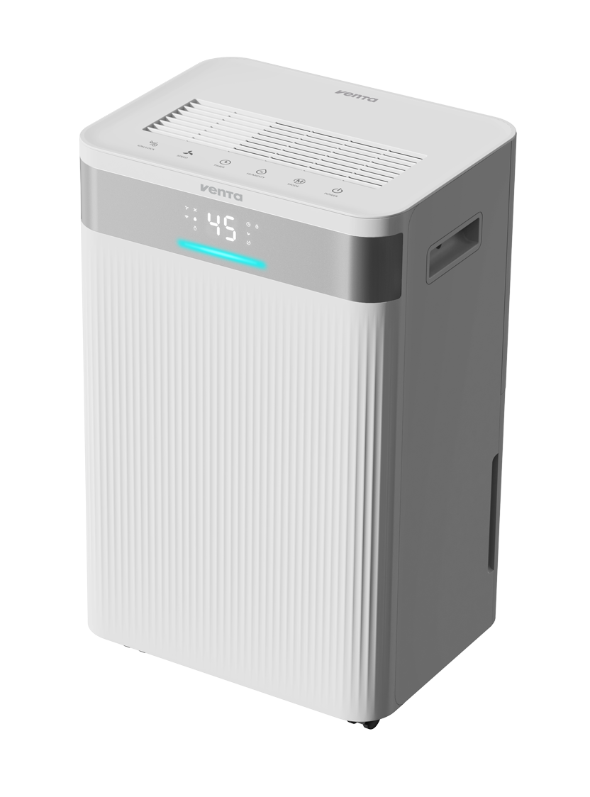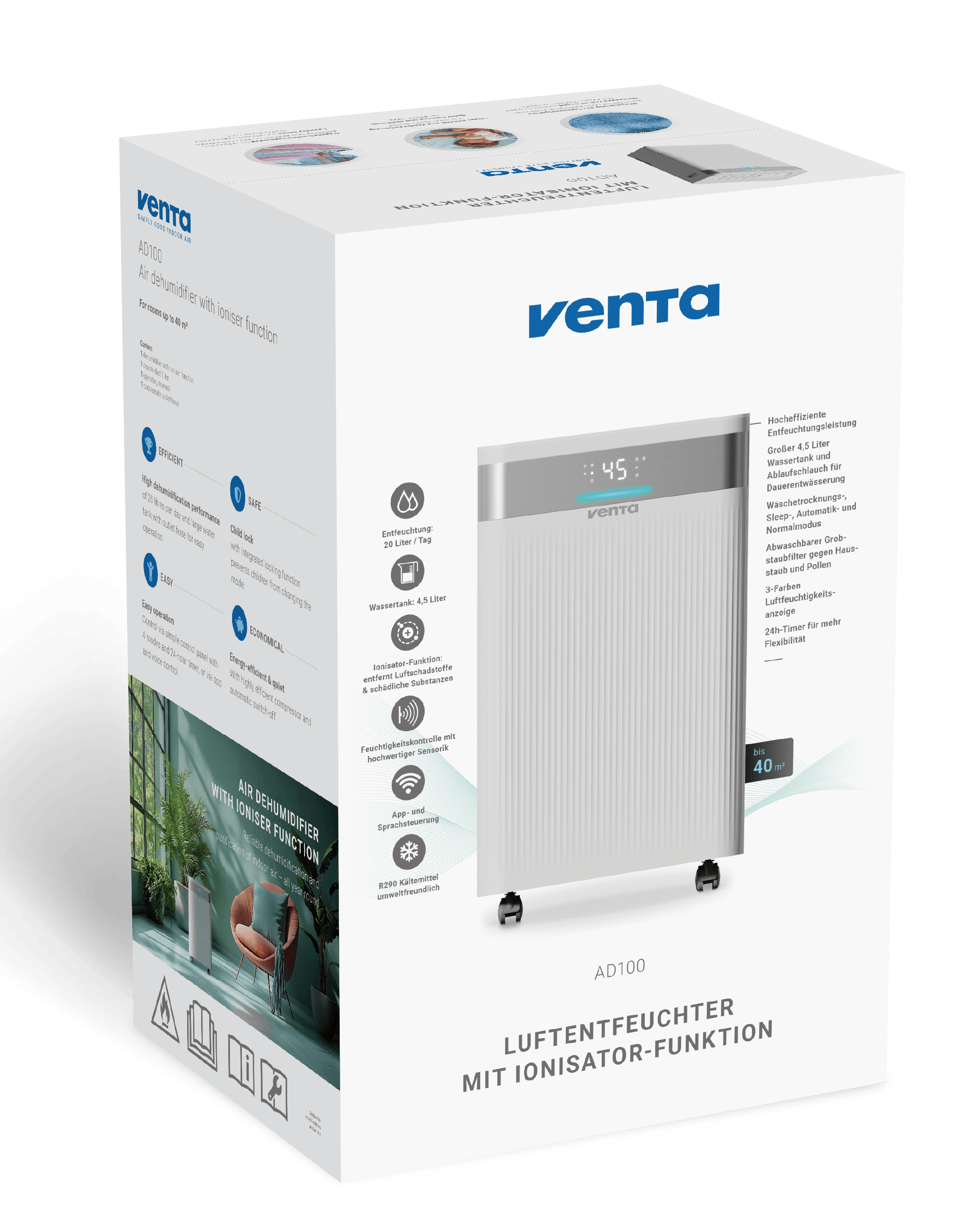 Venta AD100 Luftentfeuchter mit Ionisator sorgt das ganze Jahr über für eine gesunde und saubere Luft in Bereichen bis 100 m². Mit einer Entfeuchtungsleistung von bis zu 20 Litern pro Tag entfernt er überschüssige Feuchtigkeit und beugt so Schimmelbildung und Fensterkondensation vor. Zusätzlich sorgen der integrierte Ionisator und der abwaschbare Grobstaubfilter dafür, dass unangenehme Gerüche, Luftschadstoffe, Hausstaub und Pollen aus der Raumluft reduziert werden. Der leistungsstarke Venta AD100 arbeitet leise und energieeffizient. Die Bedienung der 4 Betriebsarten (Wäschetrockner-, Sleep-, Auto- oder Normal-Modus) erfolgt entweder direkt am Gerät oder über die Venta-App bzw. Sprachsteuerung. Der intelligente Feuchtigkeitssensor mit LED-Farbleuchten überwacht die Luftfeuchtigkeit und ermöglicht einen sorglosen Tag- und Nachtbetrieb. Dank Kindersicherung und umweltfreundlichem R290-Kältemittel ist er bestens für die Zukunft gerüstet. Venta - Innovative Technik „Made in Germany”