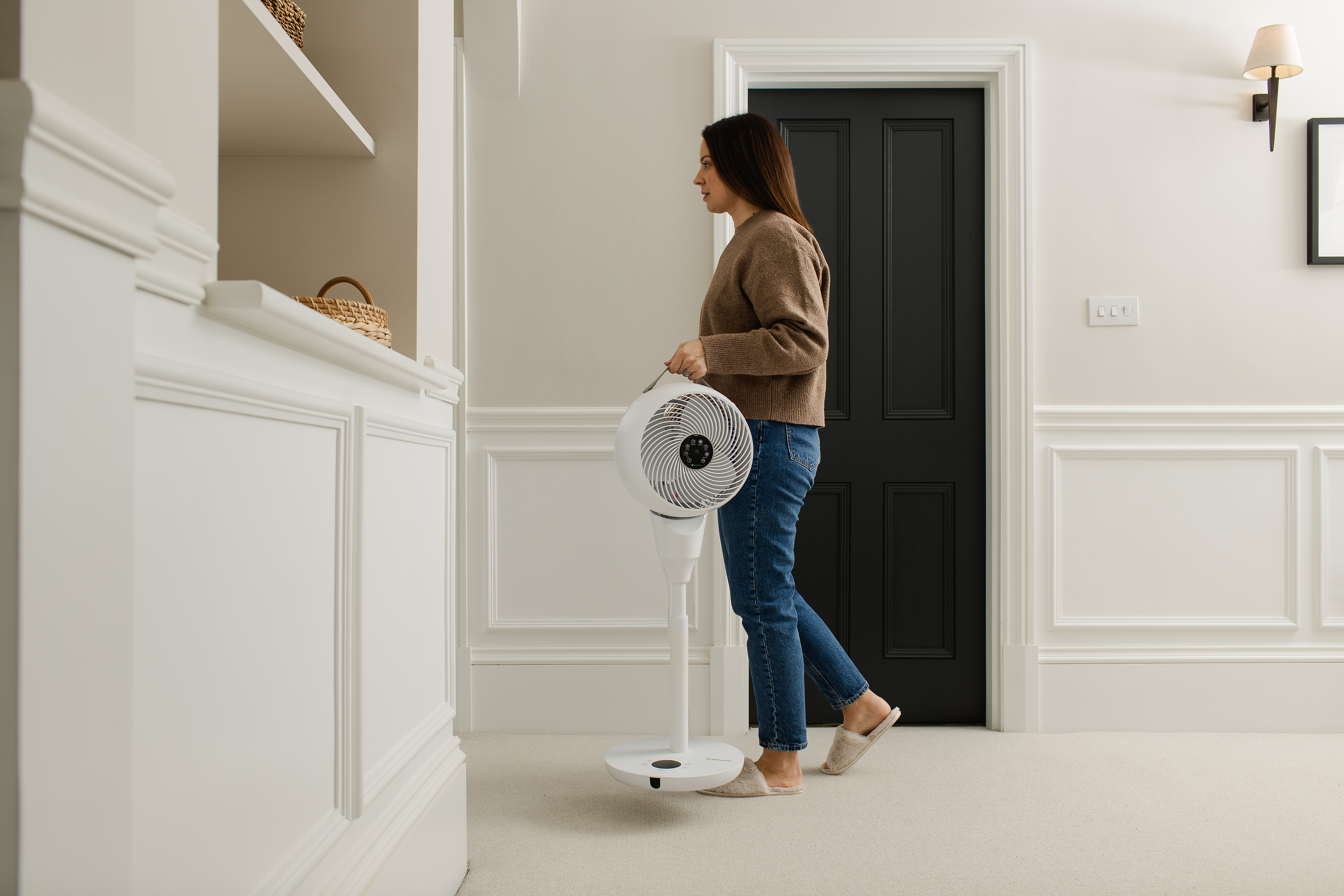 MeacoFan 1056 P Ventilator ist ein preisgekrönter, höhenverstellbarer Stand- oder Sockelventilator. Sein sehr energieeffizienter DC-Motor (6 - 24 Watt) sorgt für einen außergewöhnlich leisen Betrieb (20 - 60 dB(A)) und eine lange Lebensdauer. Der Luftstrom zirkuliert in verschiedene Richtungen (horizontal und vertikal) und sorgt für eine Abkühlung im ganzen Raum. MeacoFan 1056 ist einfach in der Bedienung (entweder Touch-Display oder Fernbedienung), 12 Lüftergeschwindigkeiten und 3 Lüftermodi ausgestattet.