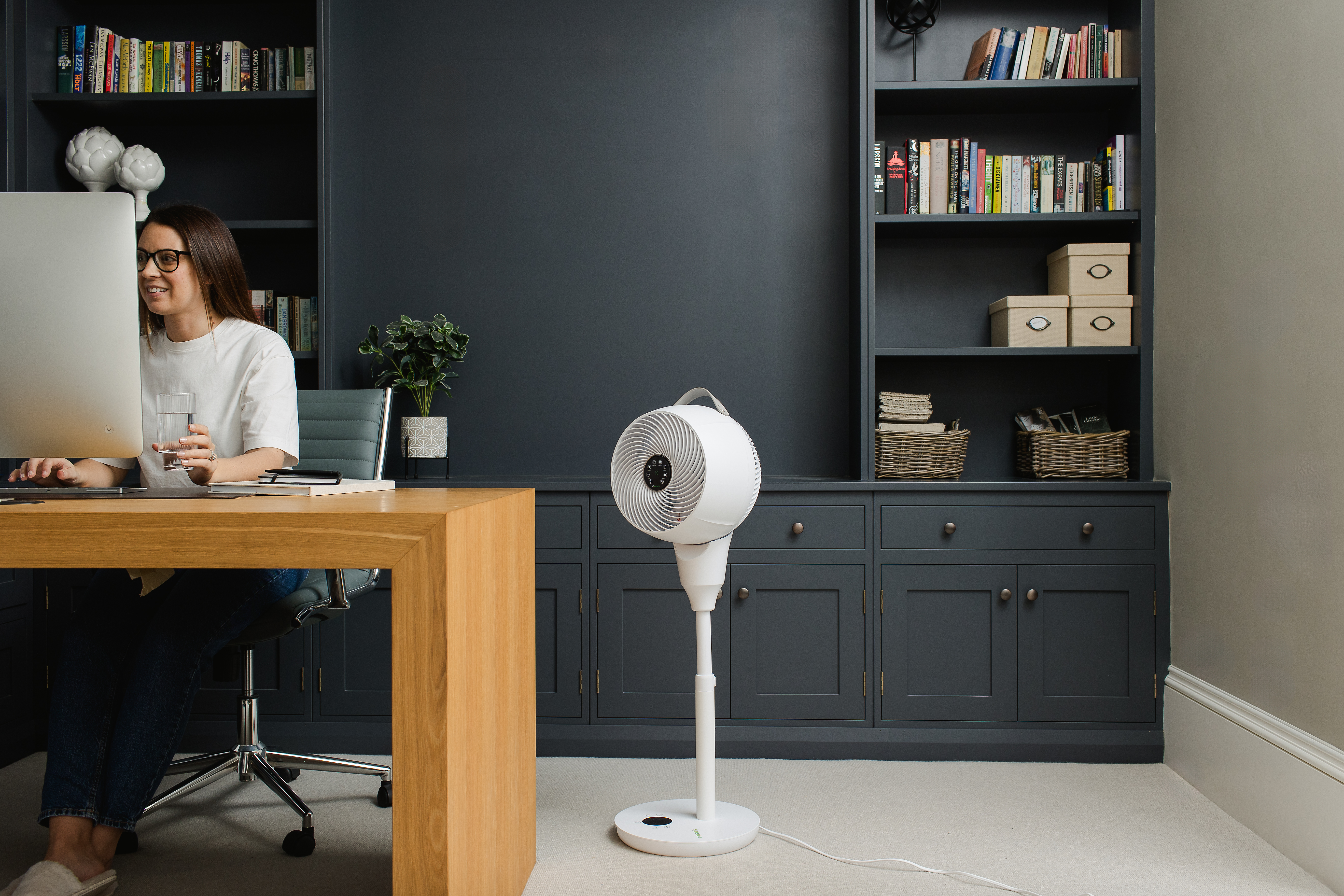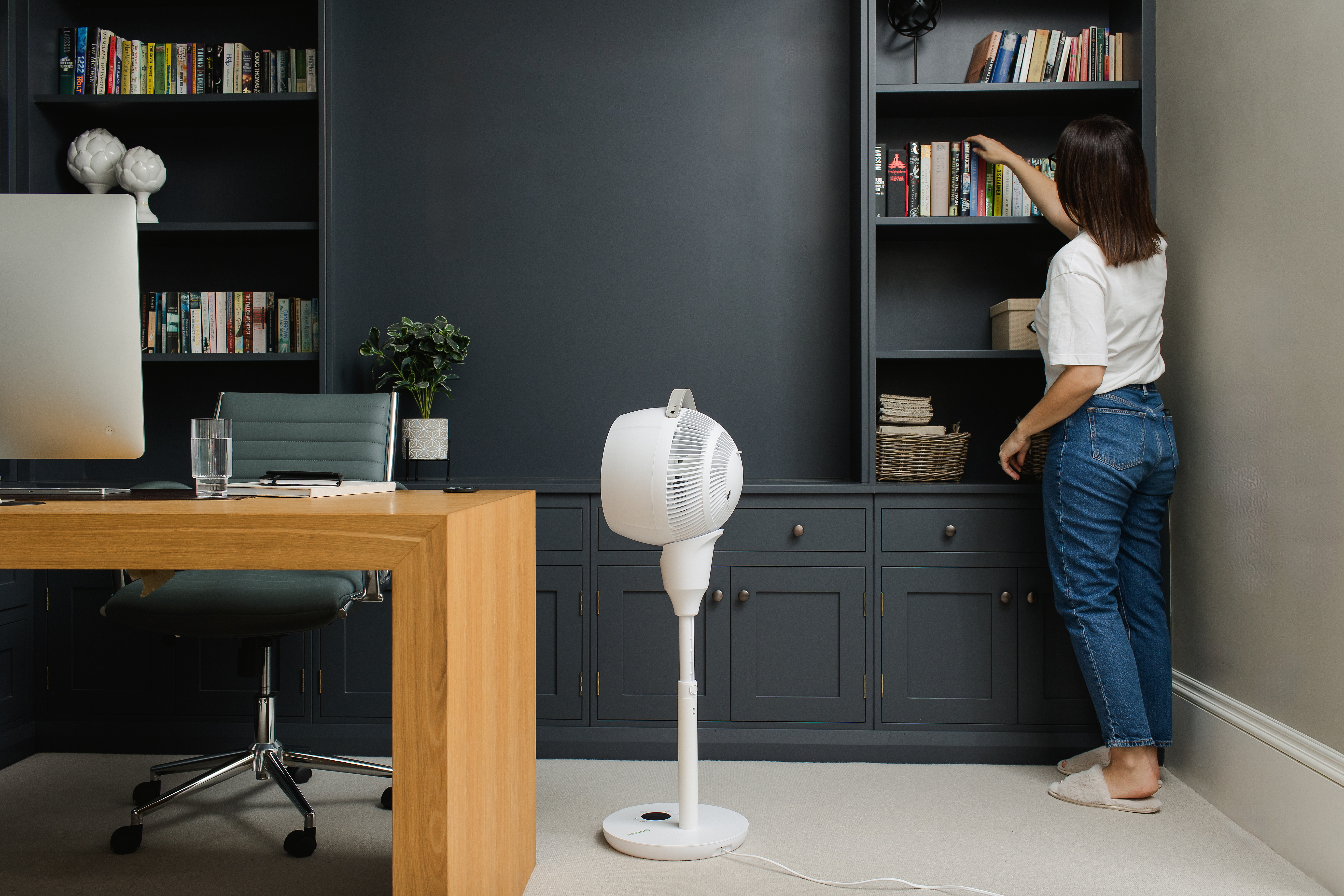 Der multidirektionale Luftstrom des MeacoFan sorgt auch dafür, dass die Luft von Ihren Wänden und Decken abprallt und somit nicht nur die Personen, die sich im direkten Luftstrom befinden abkühlt, sondern den ganzen Raum (Luftumwälzung von 1.056 m³/h). Sobald die Luft sich bewegt, können Sie den Ventilator herunterschalten und Ihr Raum bleibt trotzdem angenehm kühl.