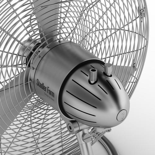 Nicht nur sein Design erinnert an die Turbine eines Jets, auch die starke Windleistung. Mit seinen drei Aluminiumflügeln bewegt dieser Ventilator bis zu 6'000 m³ Luft pro Stunde. Durch den rundgeformten Fuss aus Zinkdruckguss bleibt Charly stramm auf dem Boden stehen und ist dennoch im Neigungswinkel und Höhe verstellbar. Die Luftumwälzung kann über drei Stufen reguliert werden. Charly ist ein stählerner Typ, besteht er doch aus Metall: Zink, Aluminium und beschichtetem Stahl. BESONDERHEITEN: Schwenkfunktion Drei Geschwindigkeitsstufen Neigung und Höhe verstellbar Einfache Reinigung der Ventilatorflügel